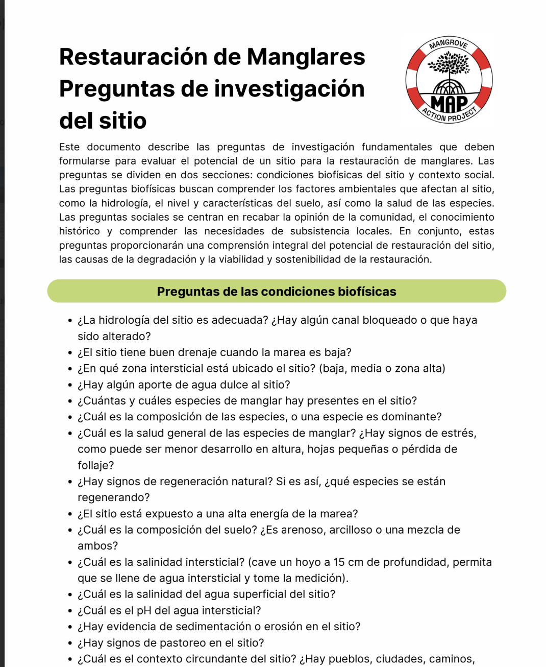 Mangrove Restoration Site Research Questions (Español)